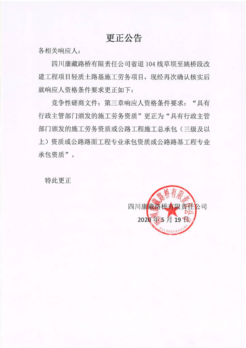 四川康藏路橋有限責任公司省道104線草壩至姚橋段改建工程項目輕質(zhì)土路基施工勞務項目更正公告