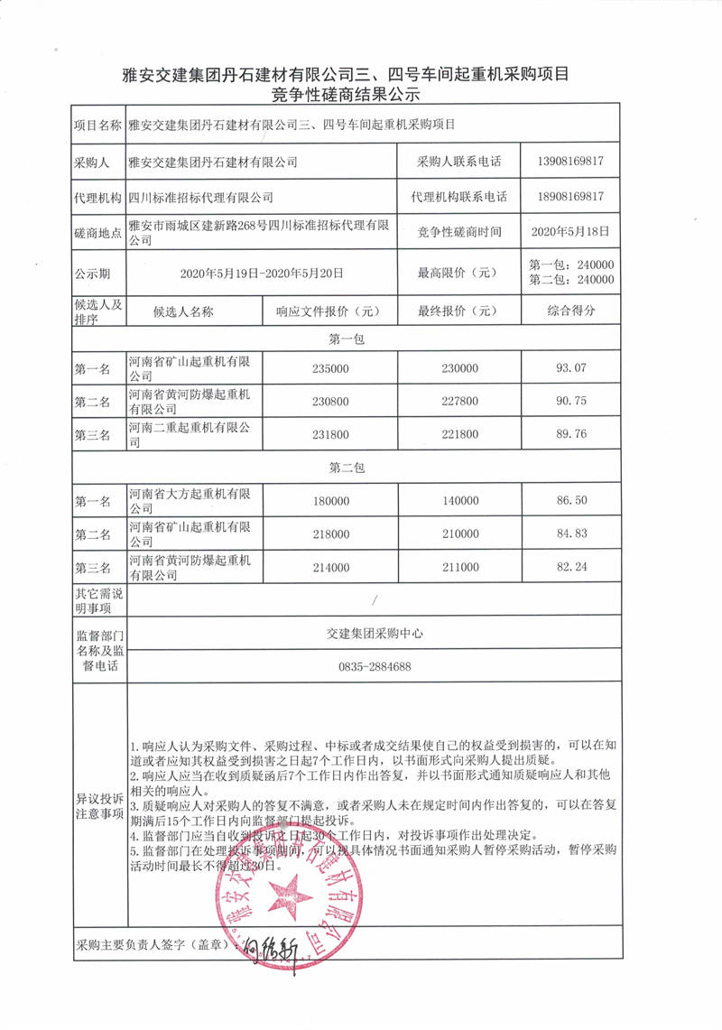 雅安交建集團(tuán)丹石建材有限公司三、四號(hào)車(chē)間起重機(jī)采購(gòu)項(xiàng)目競(jìng)爭(zhēng)性磋商結(jié)果公示