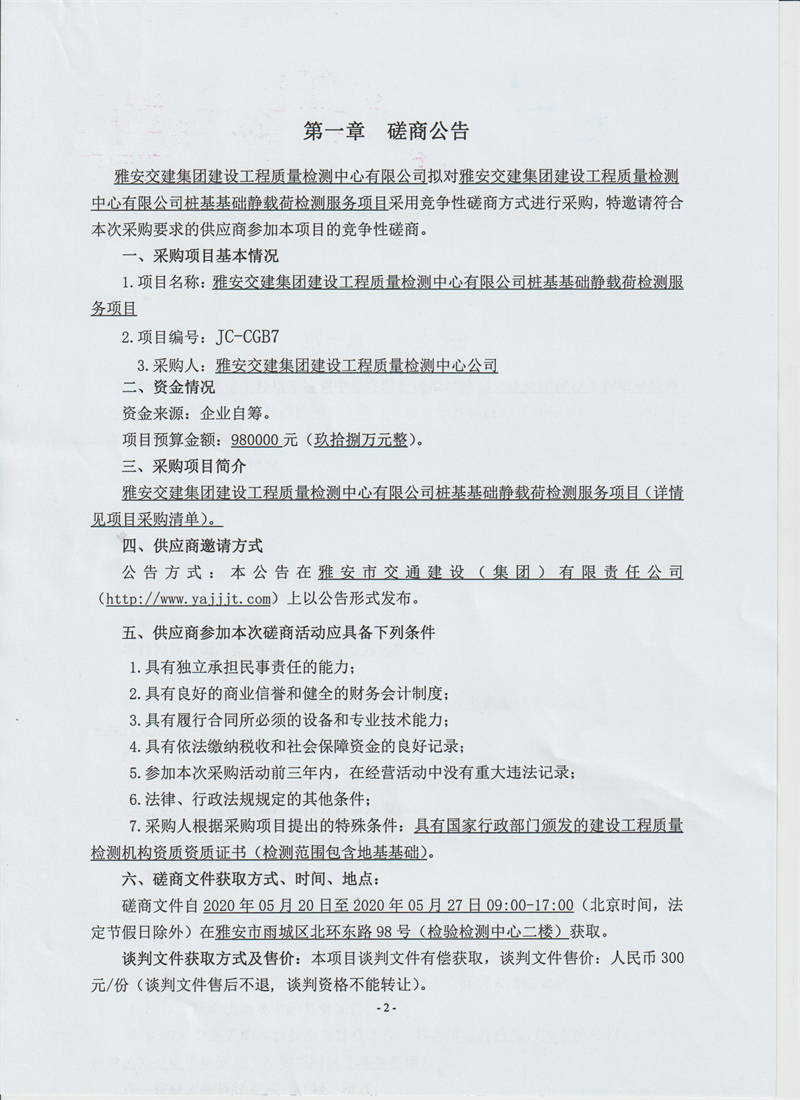 雅安交建集團(tuán)建設(shè)工程質(zhì)量檢測(cè)中心有限公司樁基基礎(chǔ)靜載荷檢測(cè)服務(wù)采購項(xiàng)目競(jìng)爭(zhēng)性磋商公告