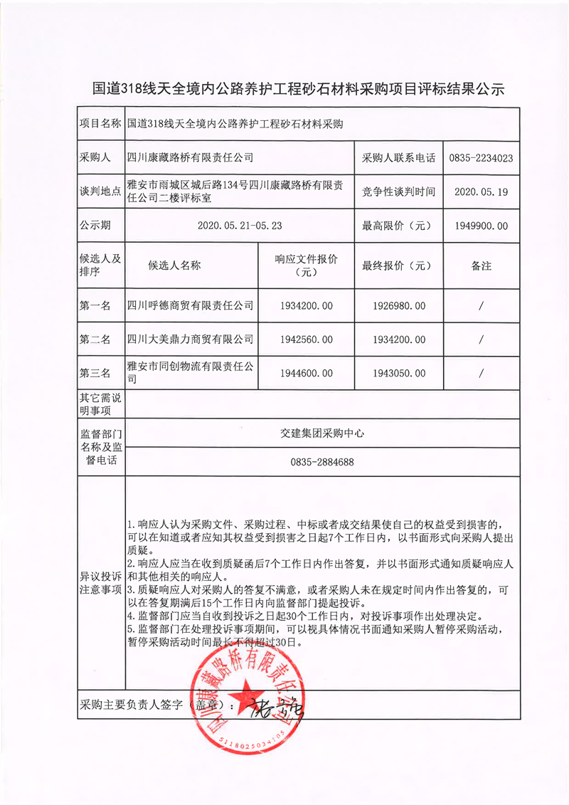 四川康藏路橋有限責任公司國道318線天全境內公路養(yǎng)護工程砂石材料采購項目評標結果公示