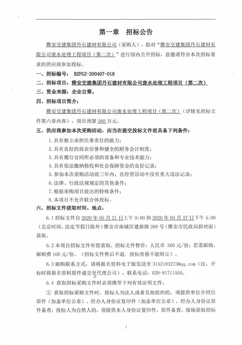 雅安交建集團(tuán)丹石建材有限公司廢水處理工程項(xiàng)目(第二次)招標(biāo)公告
