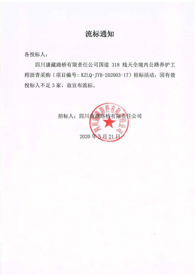 四川康藏路橋有限責(zé)任公司國道318線天全境內(nèi)公路養(yǎng)護工程瀝青采購項目流標通知