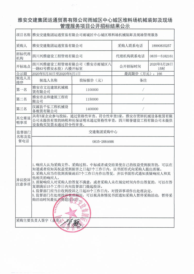 雅安交建集團(tuán)運(yùn)通貿(mào)易有限公司雨城區(qū)中心城區(qū)堆料場(chǎng)機(jī)械裝卸及現(xiàn)場(chǎng)管理服務(wù)項(xiàng)目公開(kāi)招標(biāo)結(jié)果公示