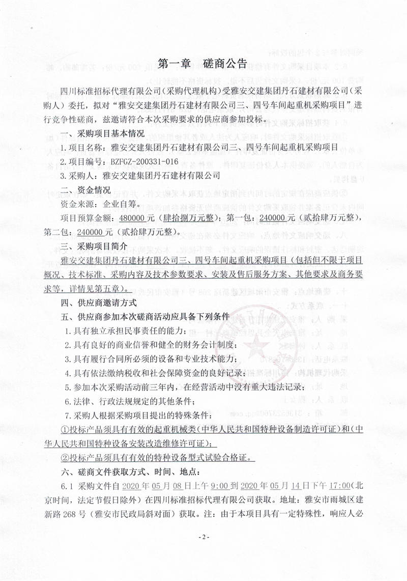 雅安交建集團(tuán)丹石建材有限公司三、四號車間起重機(jī)采購項目競爭性磋商公告