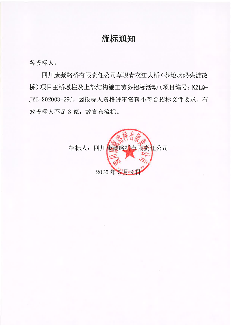 四川康藏路橋有限責(zé)任公司草壩青衣江大橋(茶地坎碼頭渡改橋)項目主橋墩柱及上部結(jié)構(gòu)施工勞務(wù)流標通知