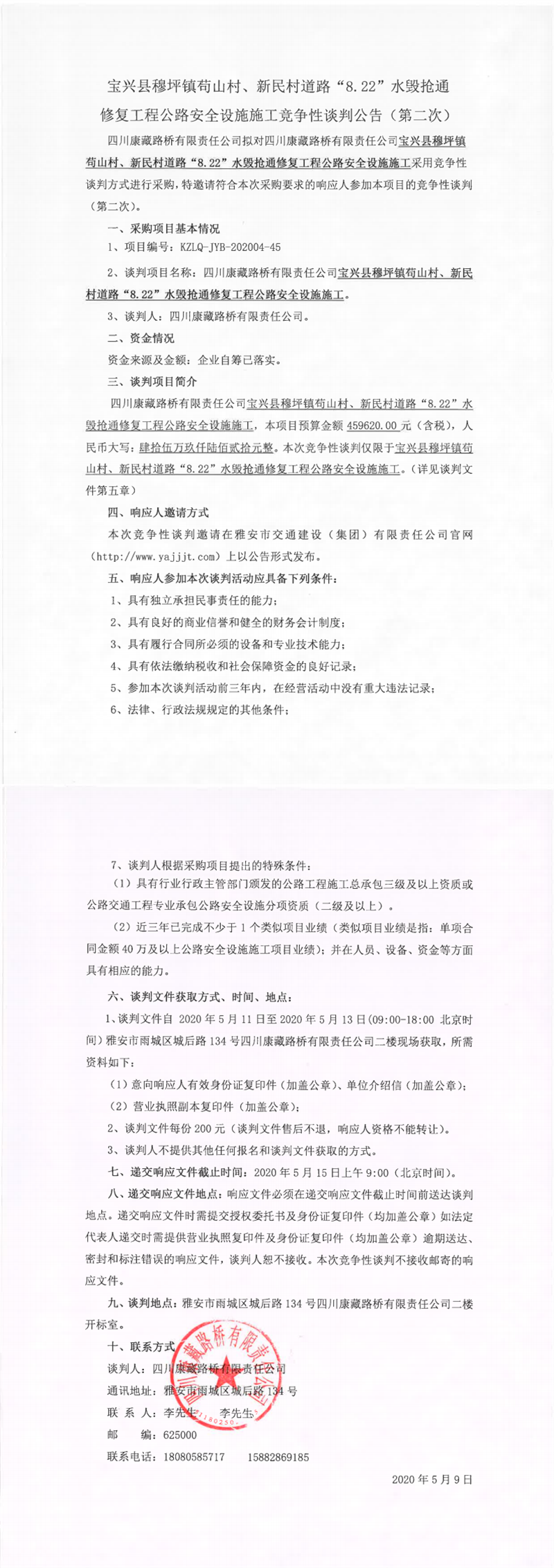 四川康藏路橋有限責任公司寶興縣穆坪鎮(zhèn)茍山村、新民村道路“8.22”水毀搶通修復工程公路安全設(shè)施施工競爭性談判公告(第二次)