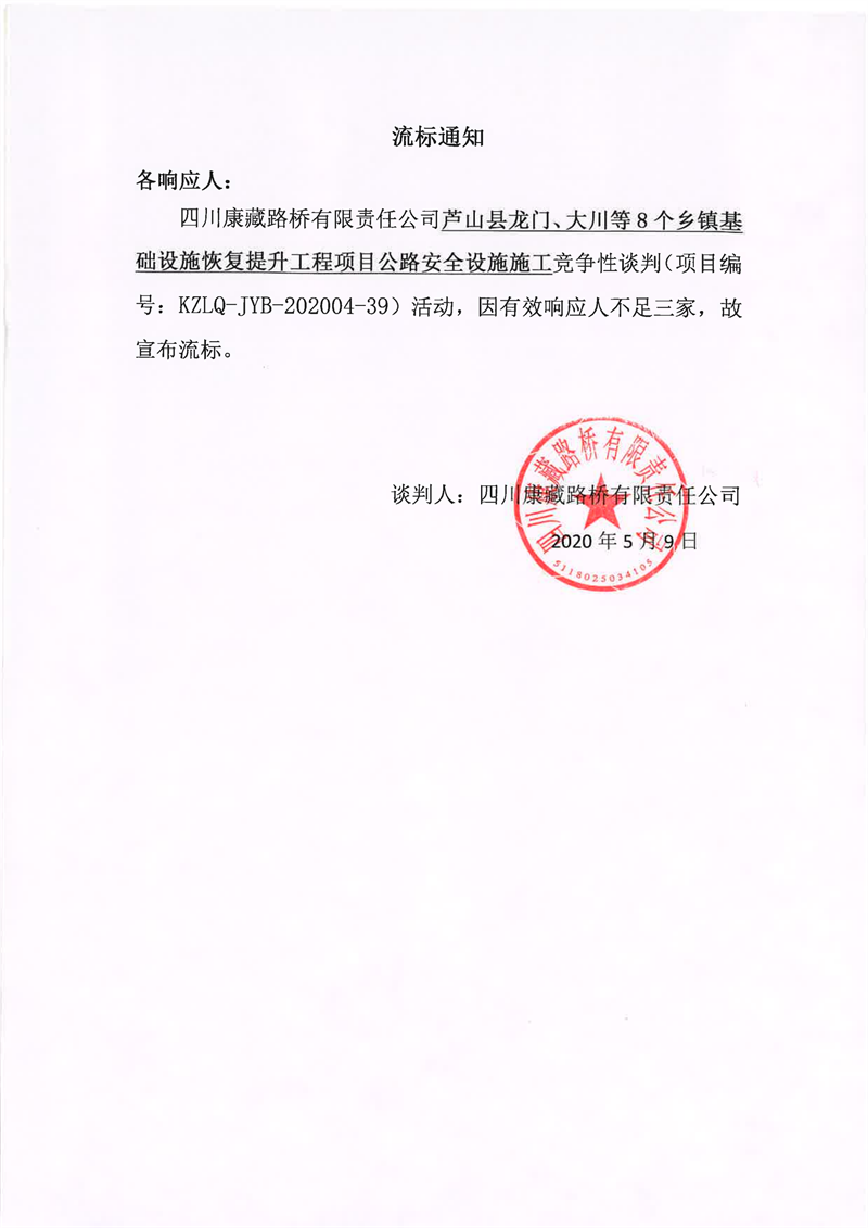四川康藏路橋有限責(zé)任公司蘆山縣龍門(mén)、大川等8個(gè)鄉(xiāng)鎮(zhèn)基礎(chǔ)設(shè)施恢復(fù)提升工程項(xiàng)目公路安全設(shè)施施工競(jìng)爭(zhēng)性談判流標(biāo)通知