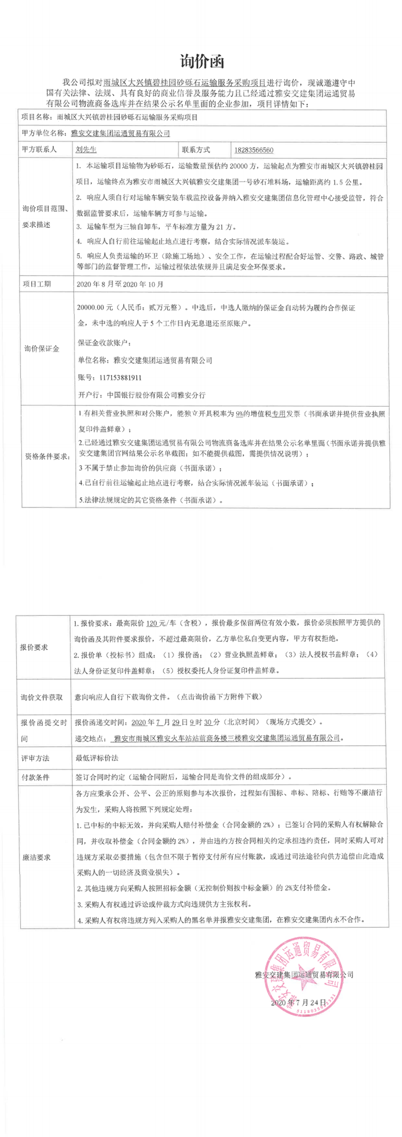 雅安交建集團(tuán)運(yùn)通貿(mào)易有限公司雨城區(qū)大興鎮(zhèn)碧桂園砂礫石運(yùn)輸服務(wù)采購項目詢價函