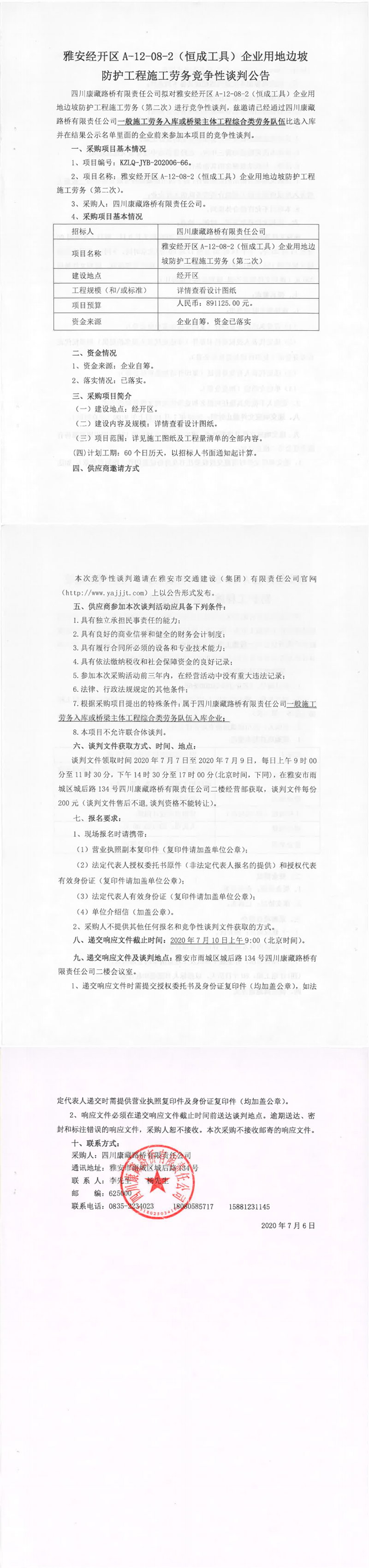 四川康藏路橋有限責(zé)任公司雅安經(jīng)開區(qū)A-12-08-2(恒成工具)企業(yè)用地邊坡防護(hù)工程施工勞務(wù)(第二次)競(jìng)爭(zhēng)性談判公告