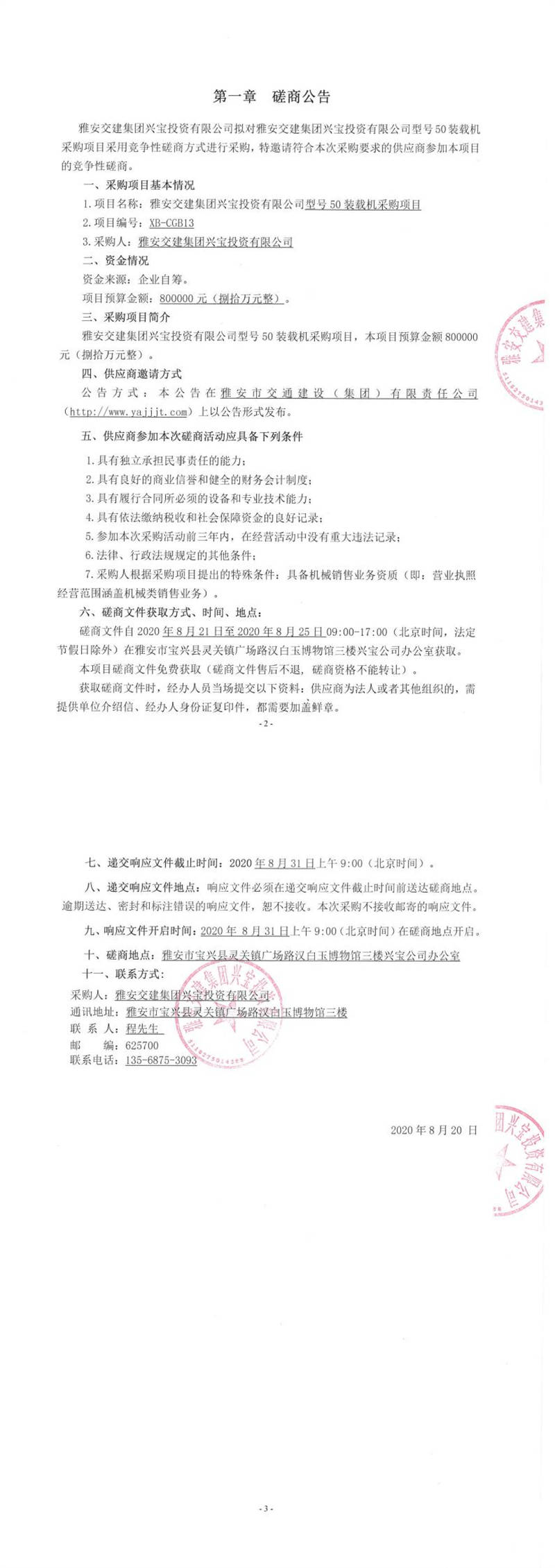 雅安交建集團興寶投資有限公司型號50裝載機采購項目磋商公告