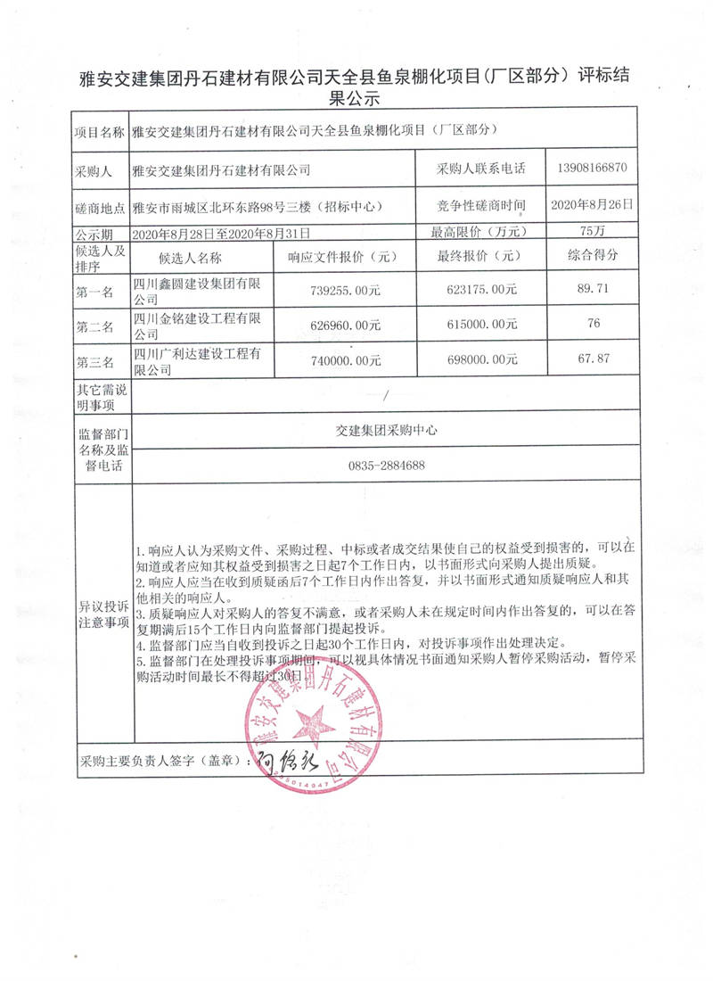 雅安交建集團丹石建材有限公司天全縣魚泉棚化項目(廠區(qū)部分)評標(biāo)結(jié)果公示