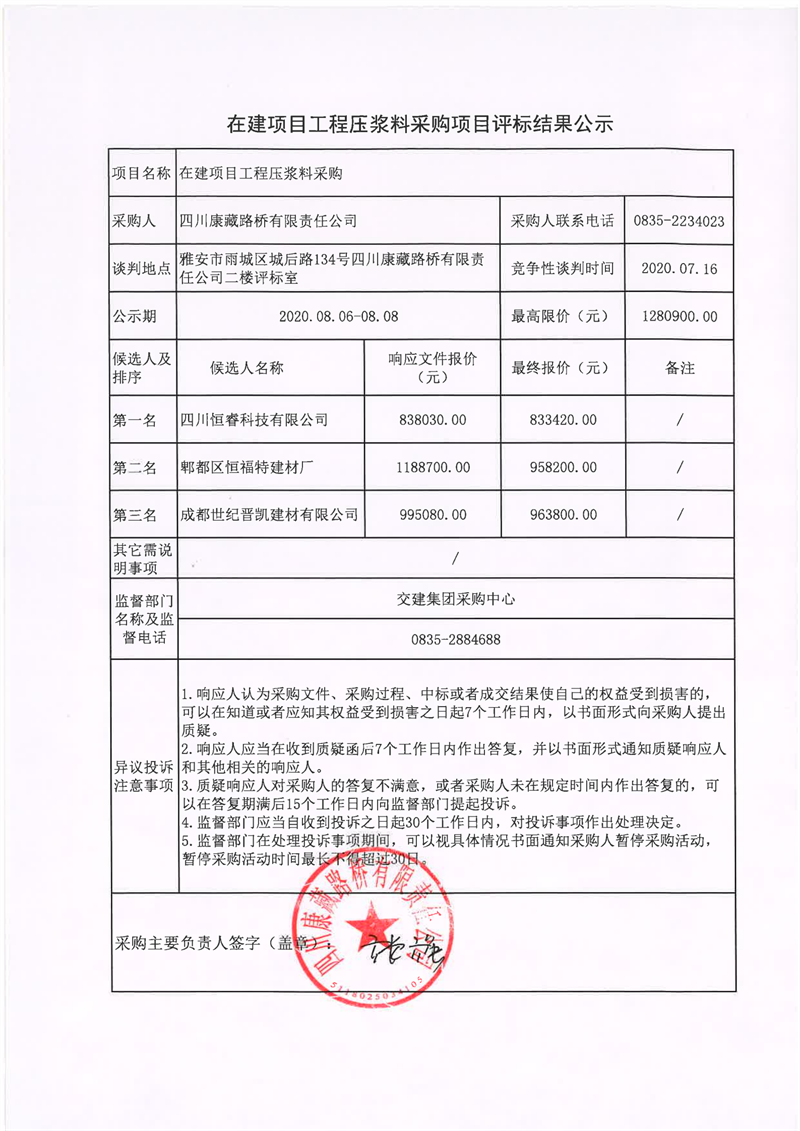四川康藏路橋有限責(zé)任公司在建項目工程壓漿料采購評標結(jié)果公示