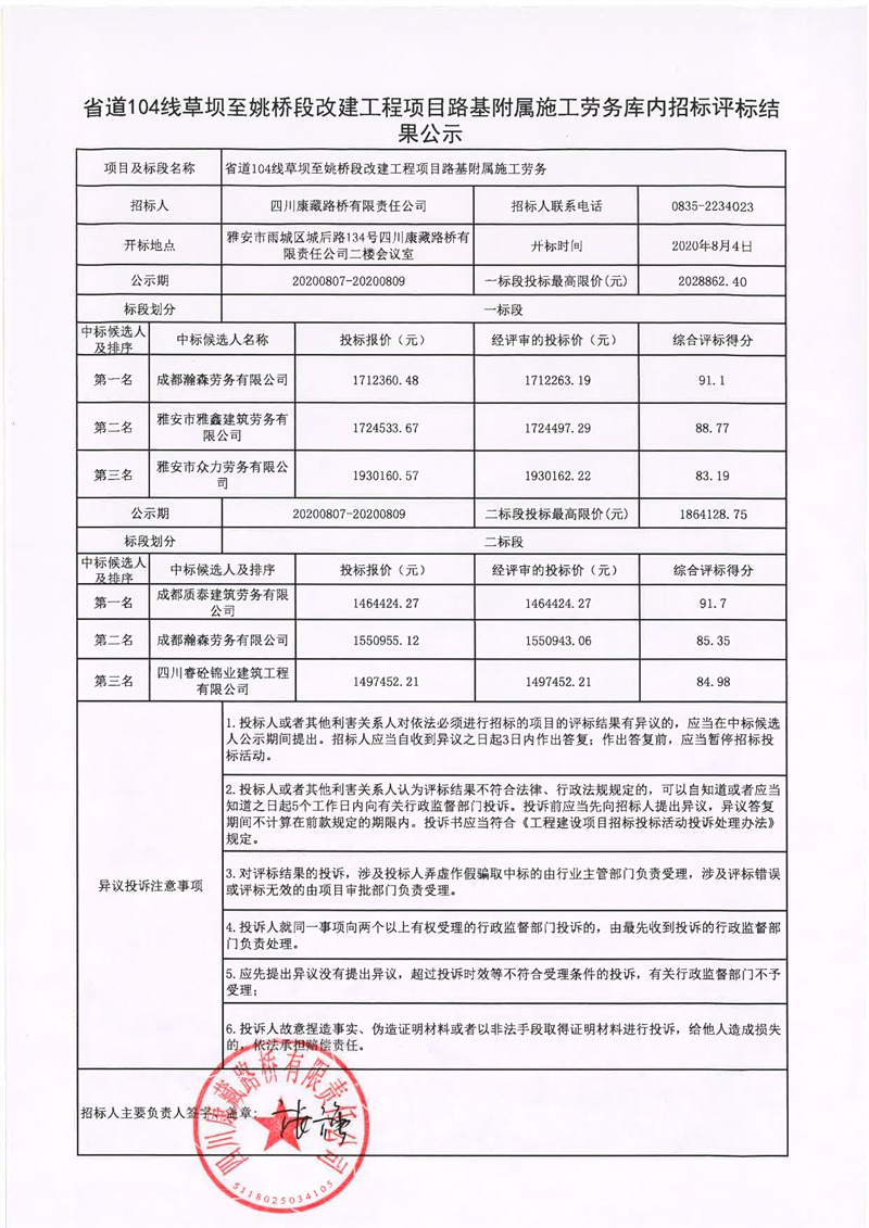 四川康藏路橋有限責任公司省道104線草壩至姚橋段改建工程項目路基附屬施工勞務(wù)庫內(nèi)招標評標結(jié)果公示