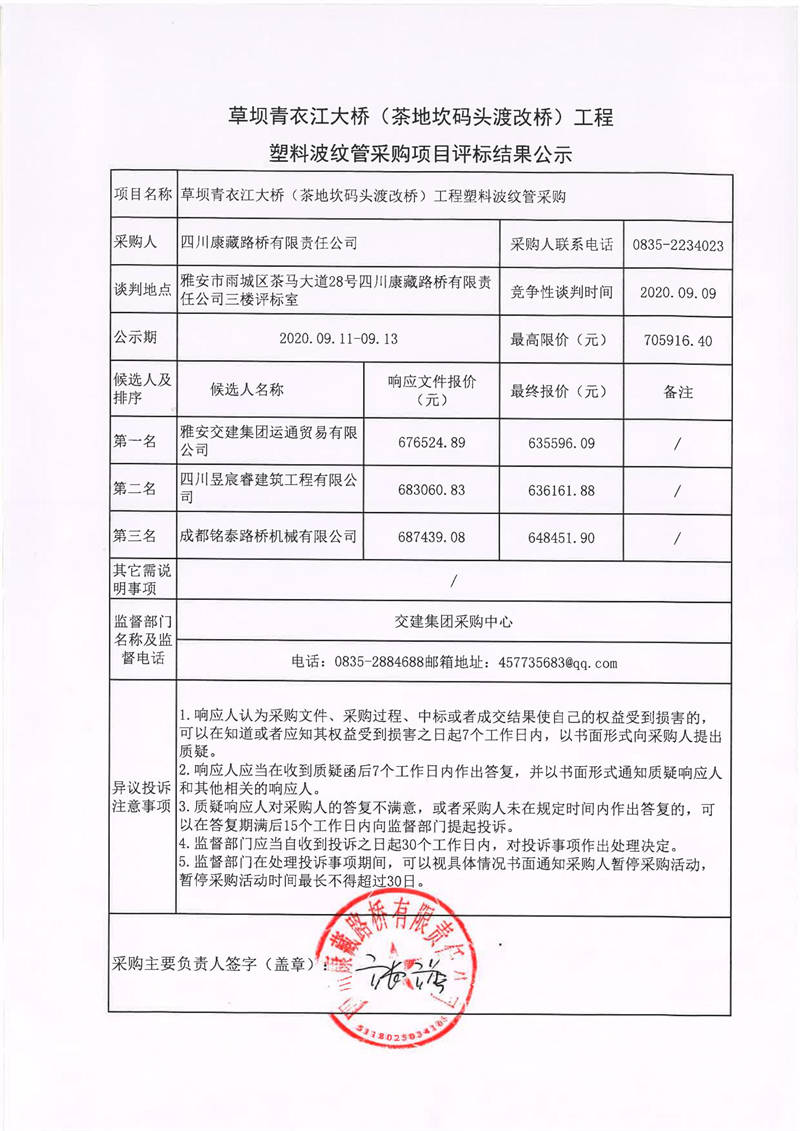四川康藏路橋有限責(zé)任公司草壩青衣江大橋(茶地坎碼頭渡改橋)工程塑料波紋管采購項(xiàng)目評(píng)標(biāo)結(jié)果公示
