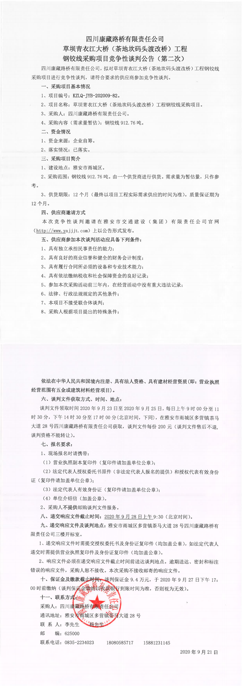 四川康藏路橋有限公司草壩青衣江大橋(茶地坎碼頭渡改橋)工程鋼鉸線采購項(xiàng)目競爭性談判公告(第二次)