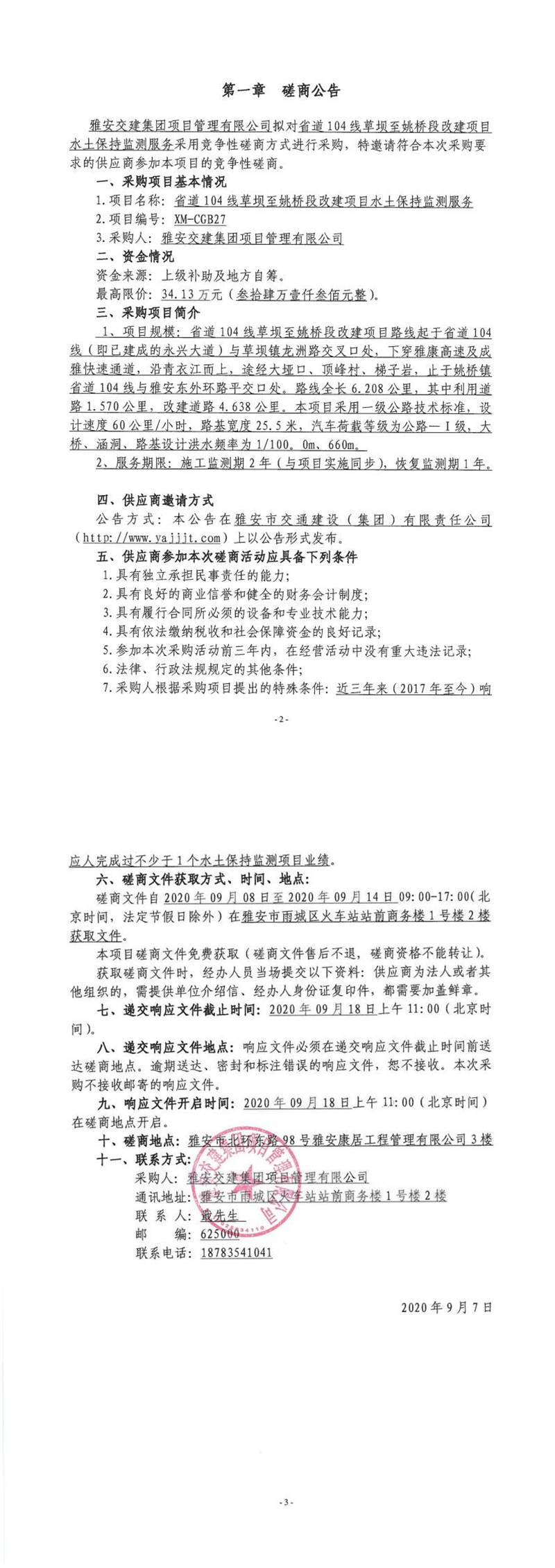 雅安交建集團(tuán)項(xiàng)目管理有限公司省道104線草壩至姚橋段改建項(xiàng)目水土保持監(jiān)測(cè)服務(wù)競(jìng)爭(zhēng)性磋商公告