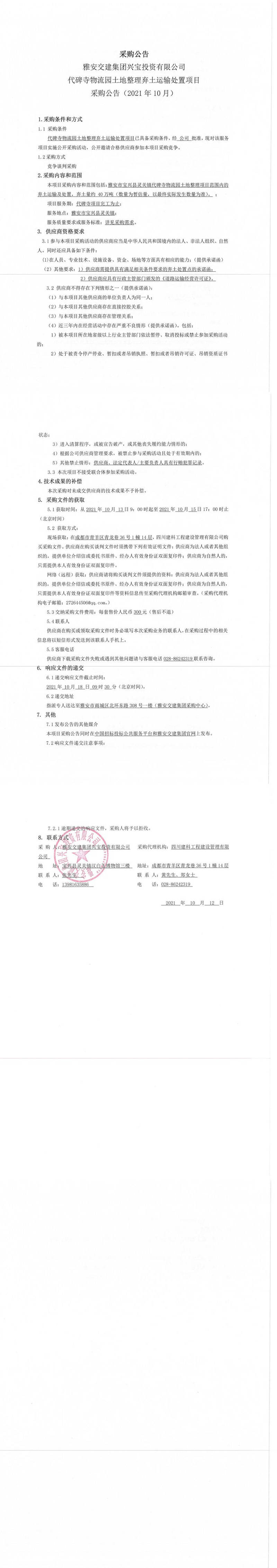 雅安交建集團興寶投資有限公司代碑寺物流園土地整理棄土運輸處置項目采購公告
