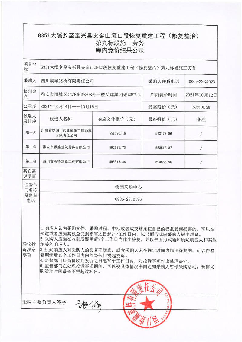 四川康藏路橋有限責(zé)任公司G351大溪鄉(xiāng)至寶興縣夾金山埡口段恢復(fù)重建工程(修復(fù)整治)第九標(biāo)段施工勞務(wù)庫內(nèi)競(jìng)價(jià)結(jié)果公示