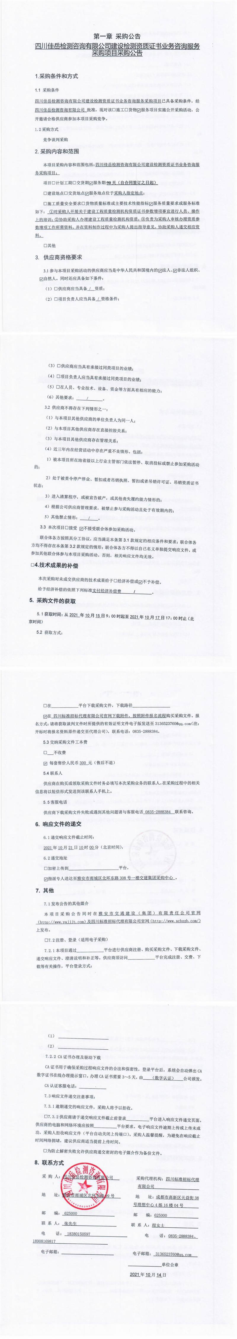 四川佳岳檢測咨詢有限公司建設檢測資質(zhì)證書業(yè)務咨詢服務采購項目采購公告