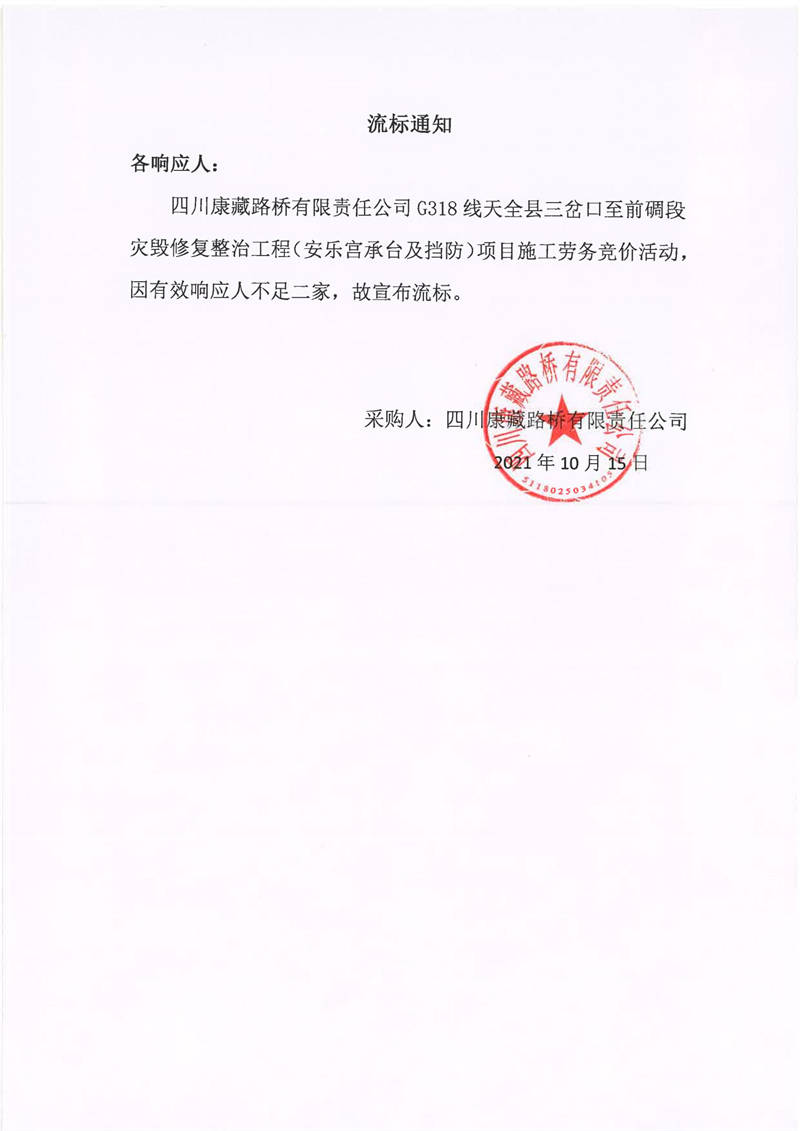 四川康藏路橋有限責(zé)任公司G318線天全縣三岔口至前碉段災(zāi)毀修復(fù)整治工程(安樂宮承臺及擋防)項(xiàng)目施工勞務(wù)流標(biāo)通知