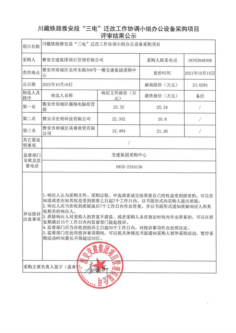 雅安交建集團項目管理有限公司川藏鐵路雅安段“三電”遷改工作協(xié)調小組辦公設備采購項目評審結果公示