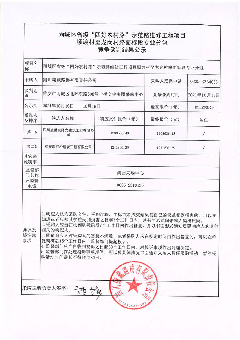 四川康藏路橋有限責任公司雨城區(qū)省級“四好農(nóng)村路”示范路維修工程項目順渡村至龍崗村路面標段專業(yè)分包競爭談判結(jié)果公示