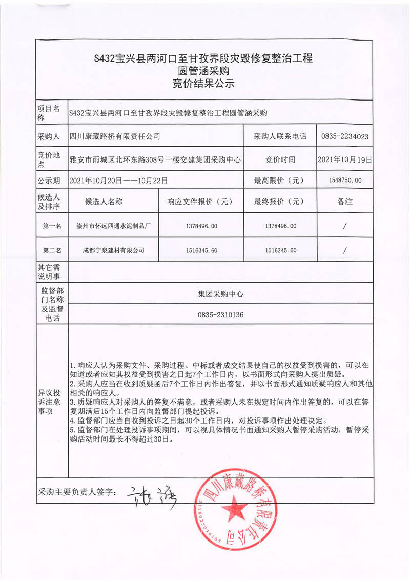 四川康藏路橋有限責任公司S432線寶興縣兩河口至甘孜界段災毀修復整治工程圓管涵采購競價結(jié)果公示