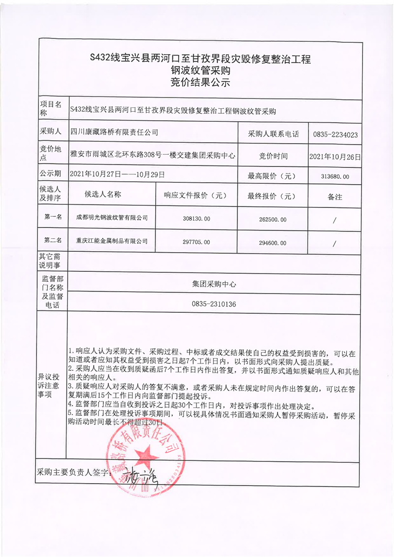 四川康藏路橋有限責(zé)任公司S432線寶興縣兩河口至甘孜界段災(zāi)毀修復(fù)整治工程鋼波紋管采購(gòu)競(jìng)價(jià)結(jié)果公示