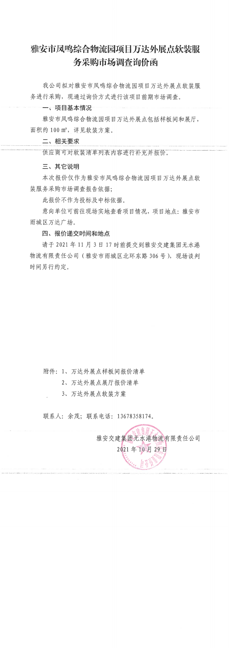 雅安交建集團無水港物流有限責(zé)任公司雅安市鳳鳴綜合物流園項目萬達外展點軟裝服務(wù)采購市場調(diào)查詢價函