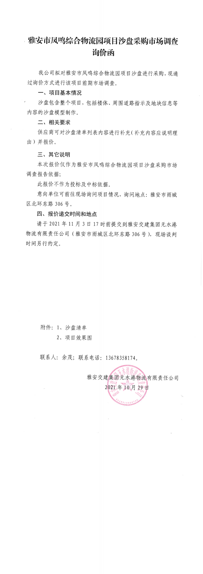 雅安交建集團(tuán)無(wú)水港物流有限責(zé)任公司雅安市鳳鳴綜合物流園項(xiàng)目沙盤(pán)采購(gòu)市場(chǎng)調(diào)查詢(xún)價(jià)函