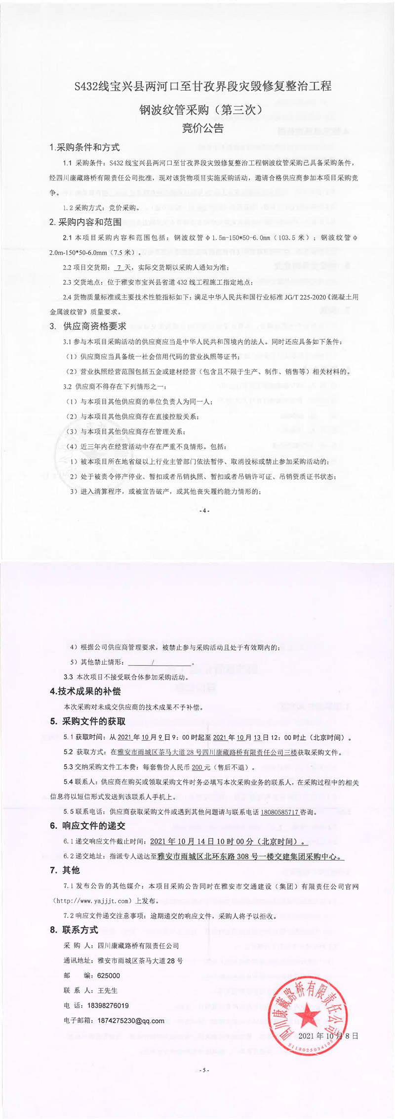 四川康藏路橋有限責(zé)任公司S432線寶興縣兩河口至甘孜界段災(zāi)毀修復(fù)整治工程鋼波紋管采購(第三次)競(jìng)價(jià)公告