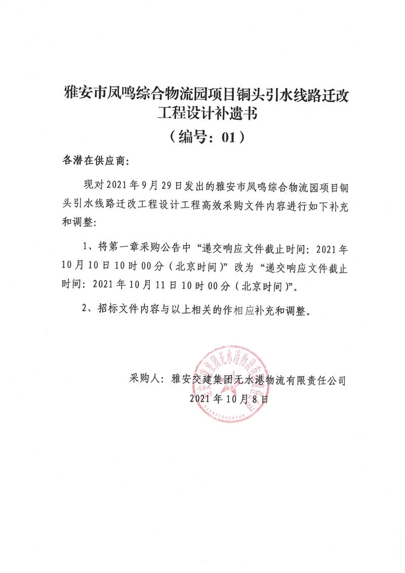 雅安交建集團(tuán)無(wú)水港物流有限責(zé)任公司雅安市鳳鳴綜合物流園項(xiàng)目銅頭引水線路遷改工程設(shè)計(jì)補(bǔ)遺書