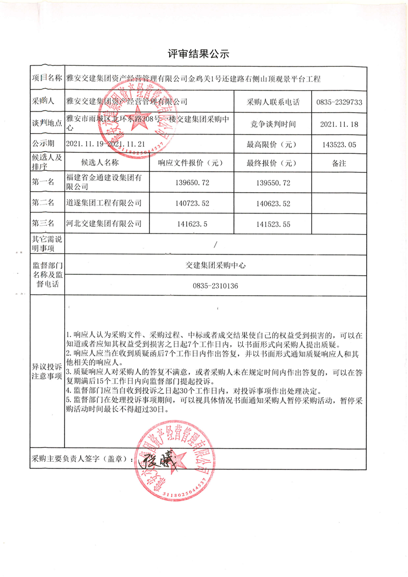 雅安交建集團(tuán)資產(chǎn)經(jīng)營管理有限公司金雞關(guān)1號還建路右側(cè)山頂觀景平臺(tái)工程評審結(jié)果公示