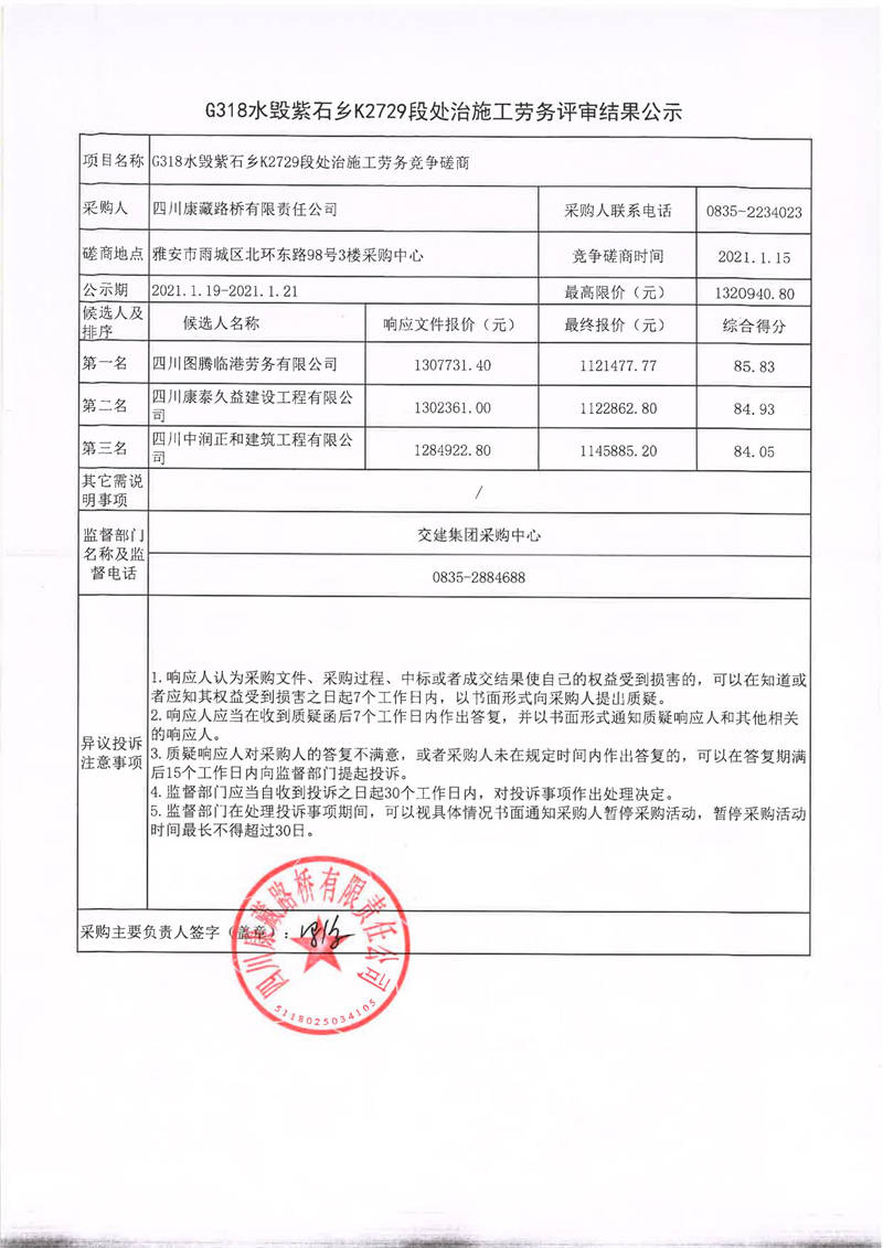 四川康藏路橋有限責(zé)任公司G318水毀紫石鄉(xiāng)K2729段處治施工勞務(wù)評審結(jié)果公示