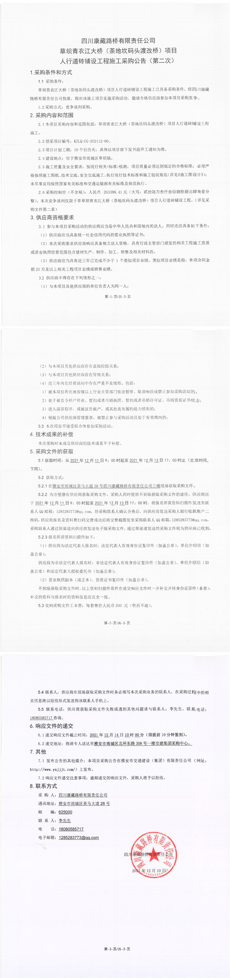 四川康藏路橋有限責(zé)任公司草壩青衣江大橋(茶地坎碼頭渡改橋)項目人行道磚鋪設(shè)工程施工采購公告(第二次)