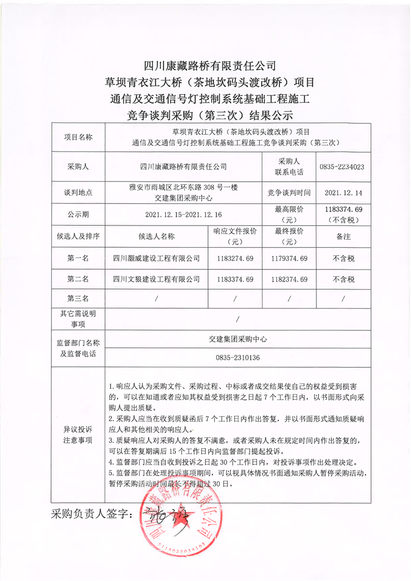 四川康藏路橋有限責(zé)任公司草壩青衣江大橋(茶地坎碼頭渡改橋)項(xiàng)目通信及交通信號(hào)燈控制系統(tǒng)基礎(chǔ)工程施工競(jìng)爭(zhēng)談判采購(gòu)(第三次)結(jié)果公示