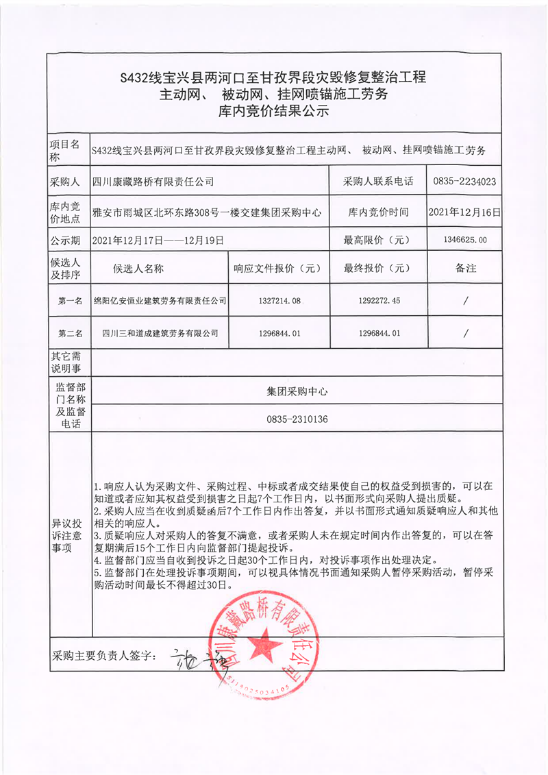 四川康藏路橋有限責(zé)任公司S432線寶興縣兩河口至甘孜界段災(zāi)毀修復(fù)整治工程主動(dòng)網(wǎng)、補(bǔ)動(dòng)網(wǎng)、掛網(wǎng)噴錨施工勞務(wù)庫內(nèi)競價(jià)結(jié)果公示