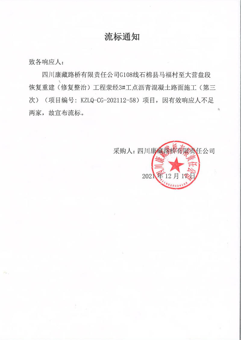 四川康藏路橋有限責(zé)任公司G108線石棉縣馬福村至大營(yíng)盤(pán)段恢復(fù)重建(修復(fù)整治)工程滎經(jīng)3#工點(diǎn)瀝青混凝土路面施工(第三次)流標(biāo)通知