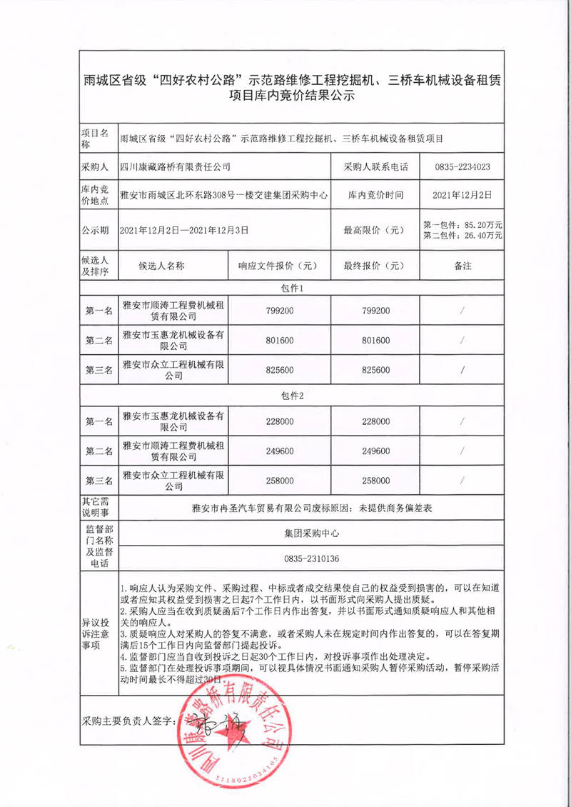 四川康藏路橋有限責(zé)任公司雨城區(qū)省級“四好農(nóng)村路”示范路維修工程挖掘機(jī)、三橋車機(jī)械設(shè)備租賃項(xiàng)目庫內(nèi)競價(jià)結(jié)果公示