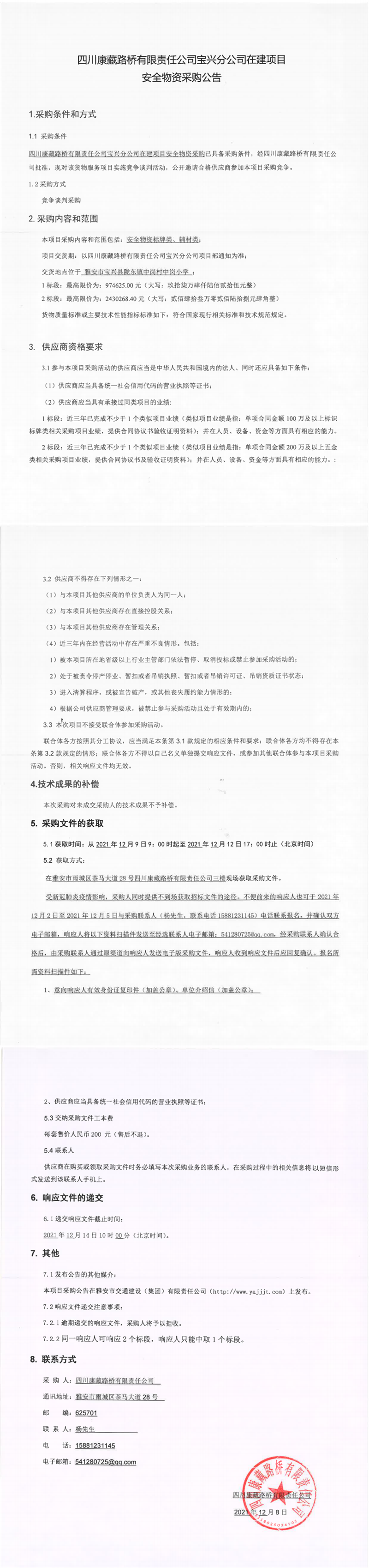 四川康藏路橋有限責(zé)任公司寶興分公司在建項(xiàng)目安全物資采購(gòu)