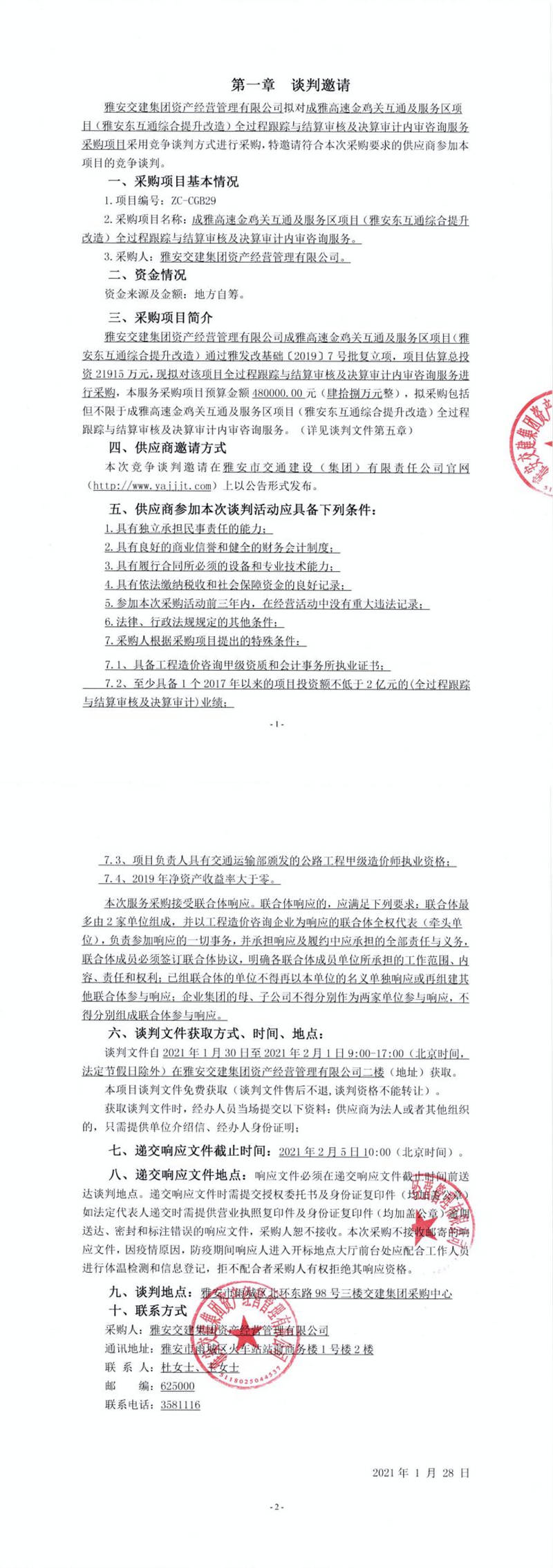 雅安交建集團(tuán)資產(chǎn)經(jīng)營管理有限公司成雅高速金雞關(guān)互通及服務(wù)區(qū)項目(雅安東互通綜合提升改造)全過程跟蹤與結(jié)算審核及決算審計內(nèi)審咨詢服務(wù)談判公告