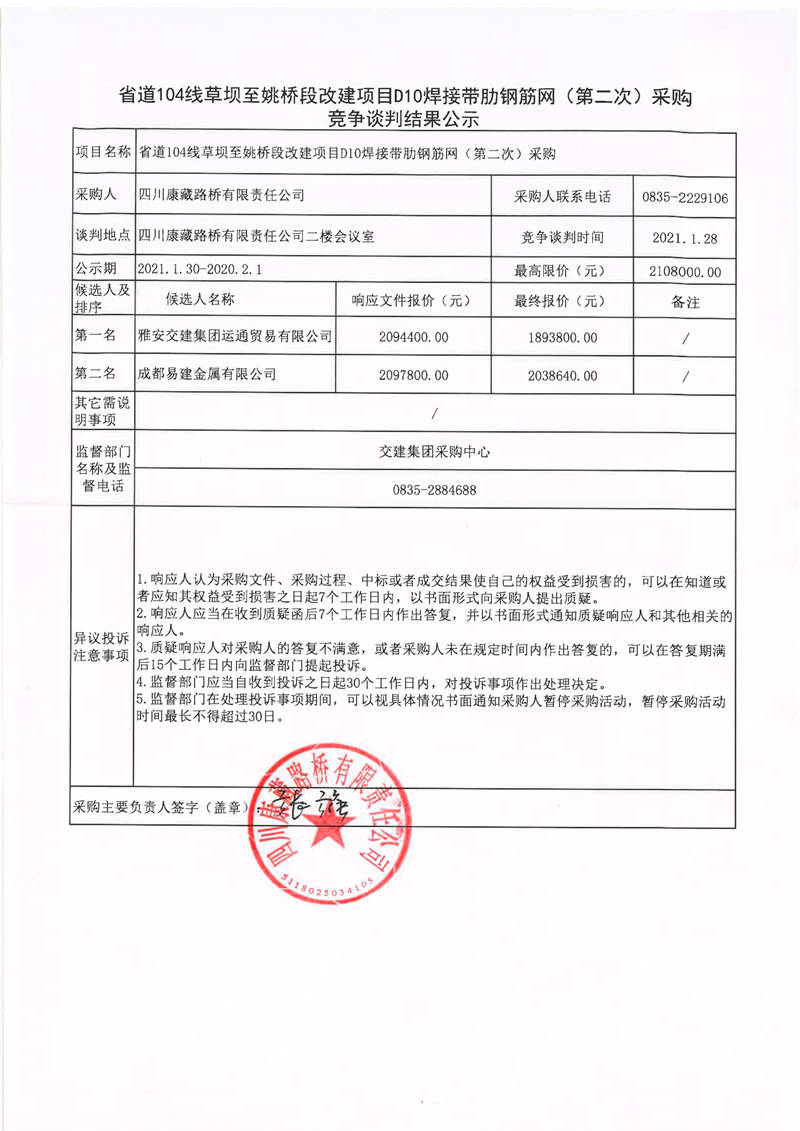四川康藏路橋有限責(zé)任公司省道104線草壩至姚橋段改建項(xiàng)目D10焊接帶肋鋼筋網(wǎng)(第二次)采購競(jìng)爭(zhēng)談判結(jié)果公示