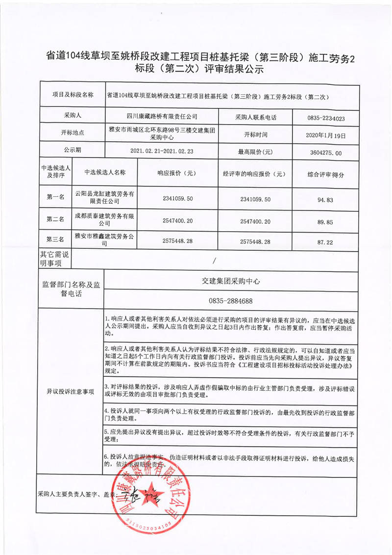 四川康藏路橋有限責任公司省道104線草壩至姚橋段改建工程項目樁基托梁(第三階段)施工勞務2標段(第二次)評審結果公示