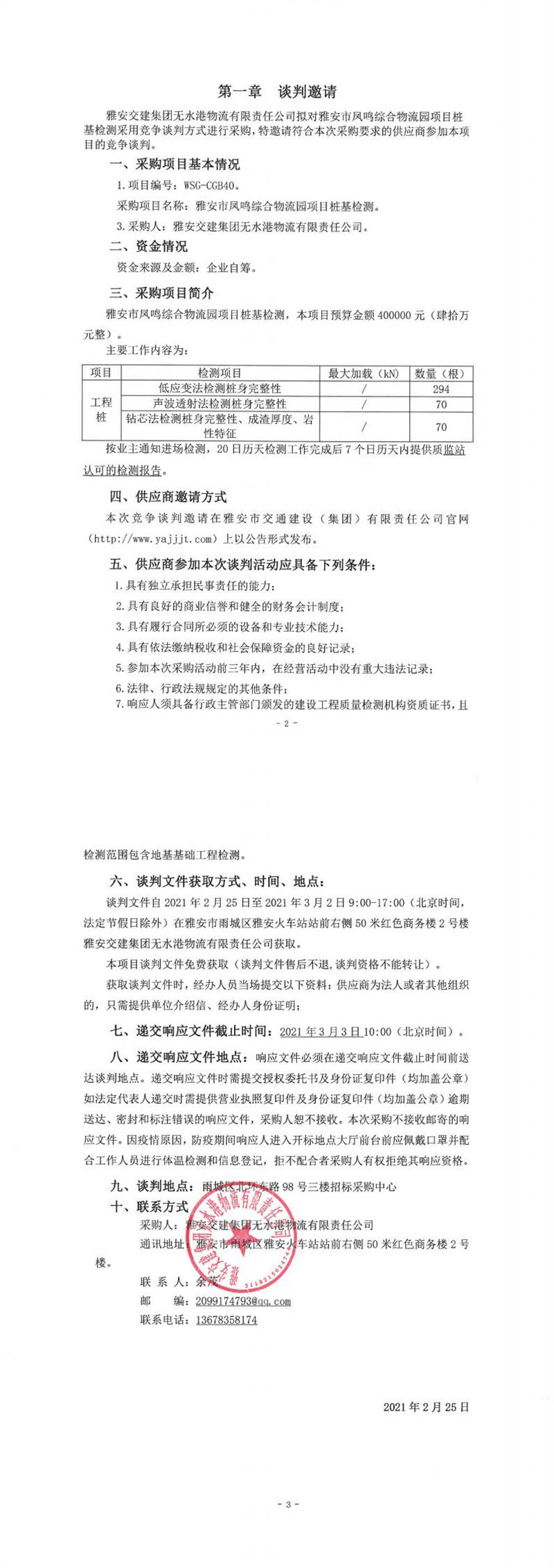 雅安交建集團(tuán)無(wú)水港物流有限責(zé)任公司雅安市鳳鳴綜合物流園項(xiàng)目樁基檢測(cè)競(jìng)爭(zhēng)談判公告