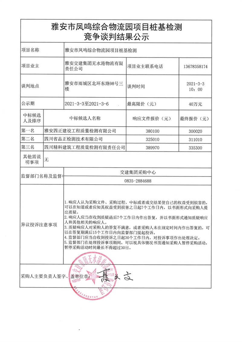 雅安交建集團無水港物流有限責任公司雅安市鳳鳴綜合物流園項目樁基檢測競爭談判結(jié)果公示
