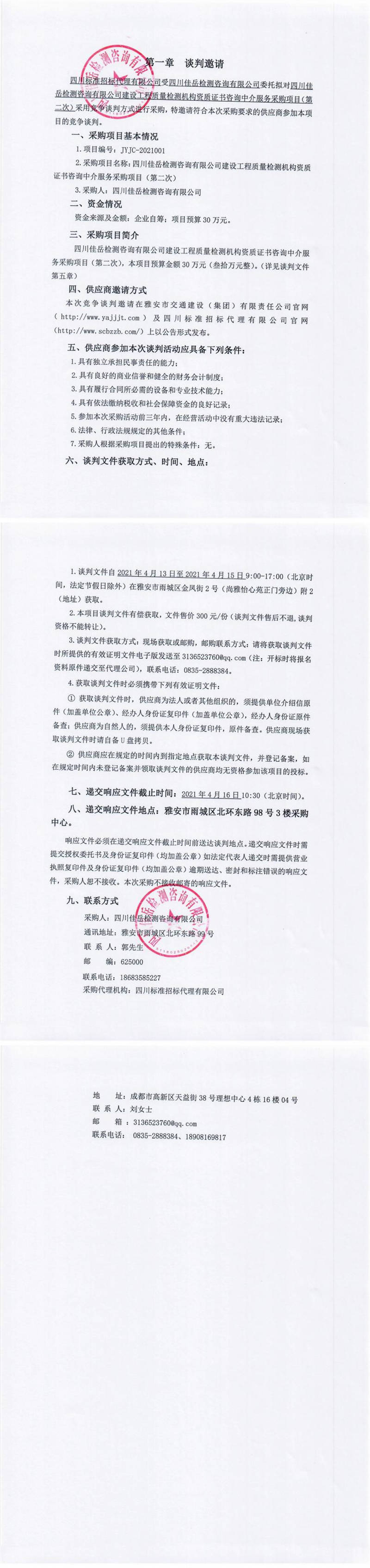 四川佳岳檢測咨詢有限公司建設(shè)工程質(zhì)量檢測機(jī)構(gòu)資質(zhì)證書咨詢中介服務(wù)采購項(xiàng)目(第二次)競爭談判公告
