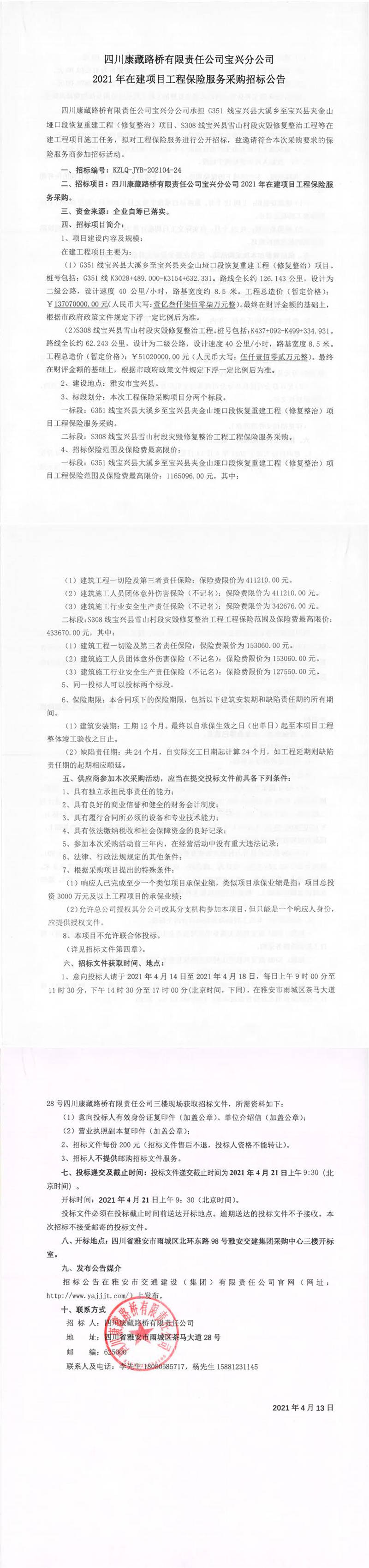 四川康藏路橋有限責任公司寶興分公司2021年在建項目工程保險服務采購招標公告