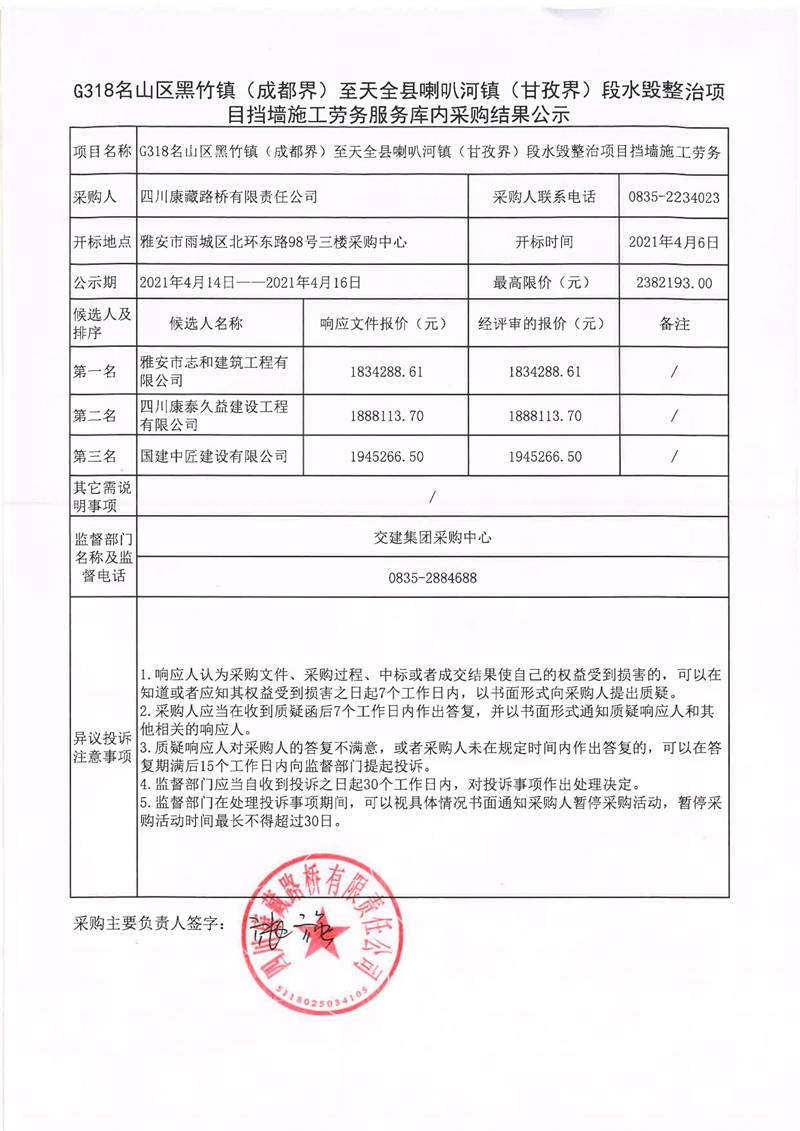 四川康藏路橋有限責(zé)任公司G318名山區(qū)黑竹鎮(zhèn)(成都界)至天全縣喇叭河鎮(zhèn)(甘孜界)段水毀整治項(xiàng)目擋墻施工勞務(wù)服務(wù)庫(kù)內(nèi)采購(gòu)結(jié)果公示