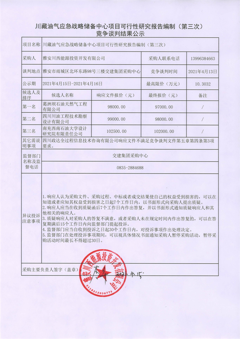 雅安川西能源投資開發(fā)有限公司川藏油氣應(yīng)急戰(zhàn)略儲備中心項目可行性研究報告編制 (第三次)競爭談判結(jié)果公示