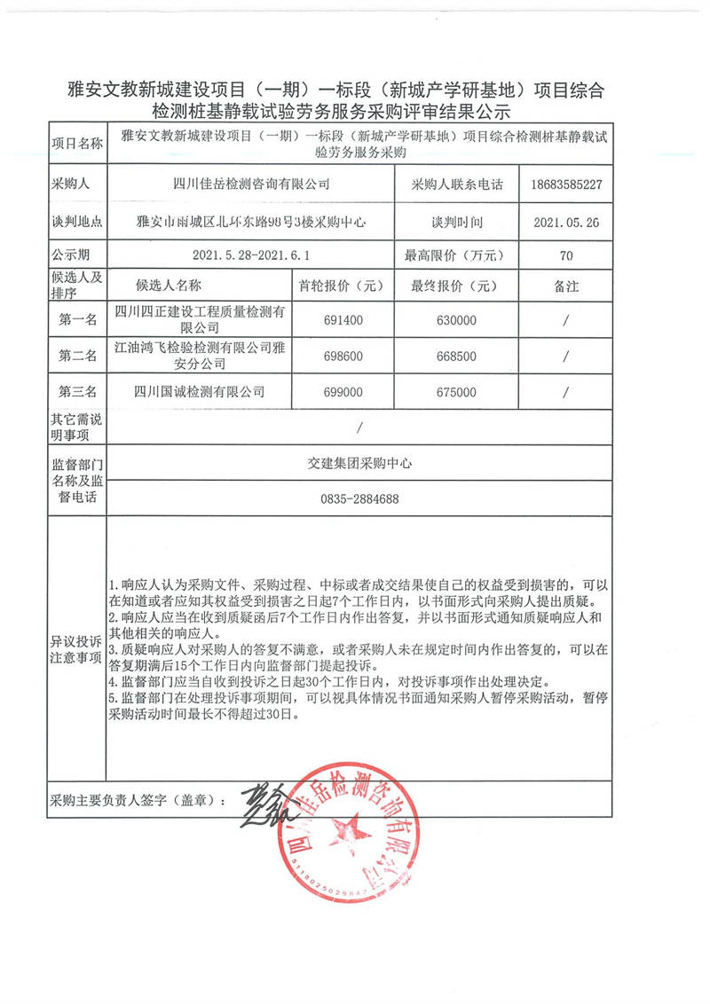 四川佳岳檢測咨詢有限公司雅安文教新城建設(shè)項目(一期)一標段(新城產(chǎn)學研基地)項目綜合檢測樁基靜載試驗勞務(wù)服務(wù)采購評審結(jié)果公示